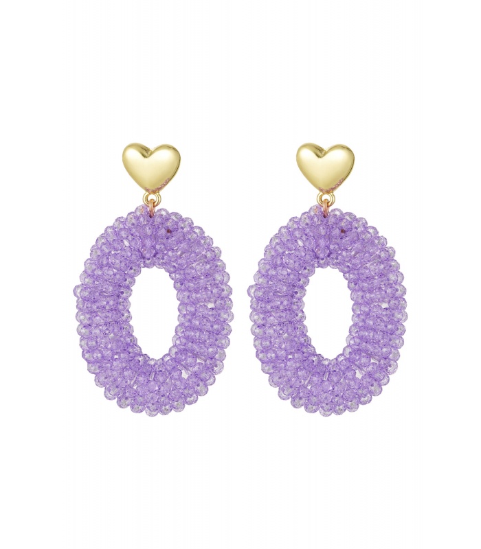 De paarseglaskralen oorhangers met goudkleurig hartje van Yehwang zijn de perfecte accessoire om je look een vleugje kleur te geven. Deze oorhangers zijn een uniek ontwerp dat opvalt. De kralen zijn van hoge kwaliteit en de goudkleurige hartjes geven een extra glans aan de oorbellen.