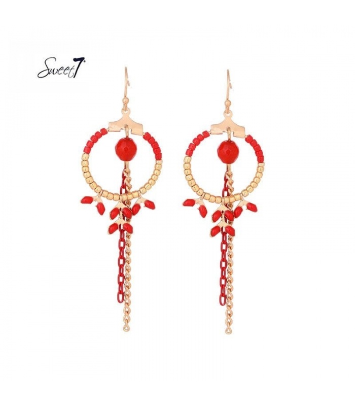 Ontdek de charme van onze rode oorhangers, verfraaid met goudkleurige kraaltjes. Deze opvallende sieraden zijn de perfecte aanvulling op elke outfit, of het nu voor een speciale gelegenheid of voor dagelijks gebruik is. De combinatie van levendige rode tinten met het subtiele glinsteren van goud creëert een onweerstaanbare look die zeker de aandacht zal trekken.