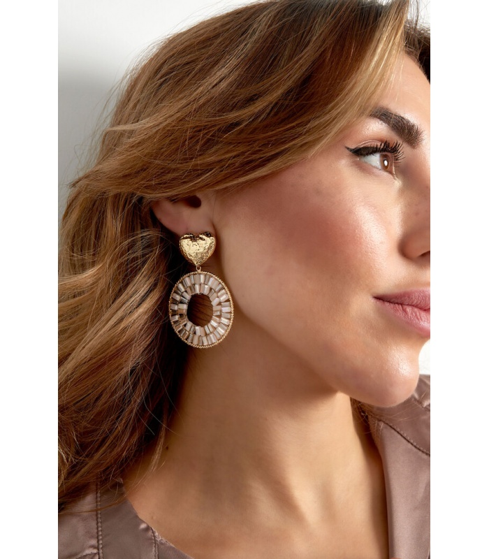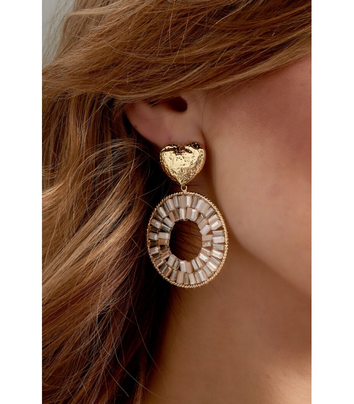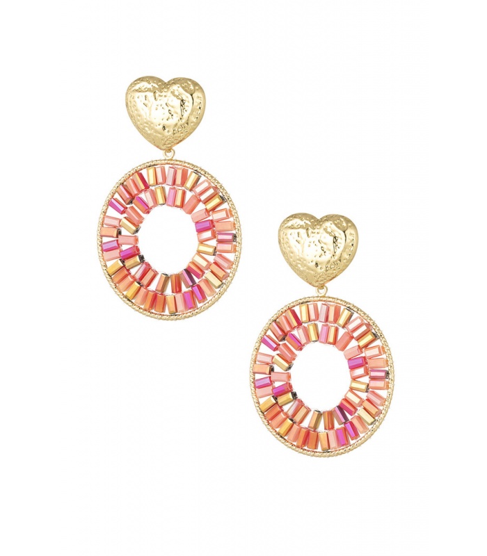 Oorbellen met glas kralen en goudkleurig hart combineren levendige kleuren met een elegant ontwerp. Deze oorbellen bestaan uit rode glaskralen die een warme, opvallende tint toevoegen aan je look. Het goudkleurige hartje zorgt voor een romantisch accent en een vleugje luxe.