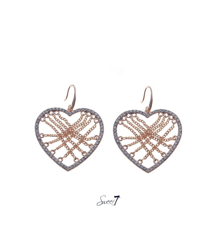 Roségold harten oorbellen met kettinkjes en strass steentjes.