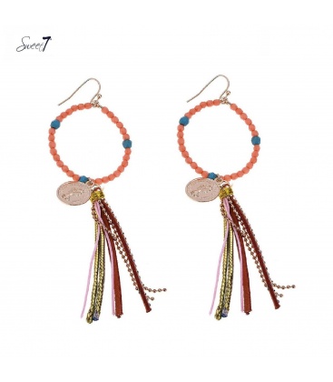 Roze kralen oorring met gekleurde strengen en een munt bedel.