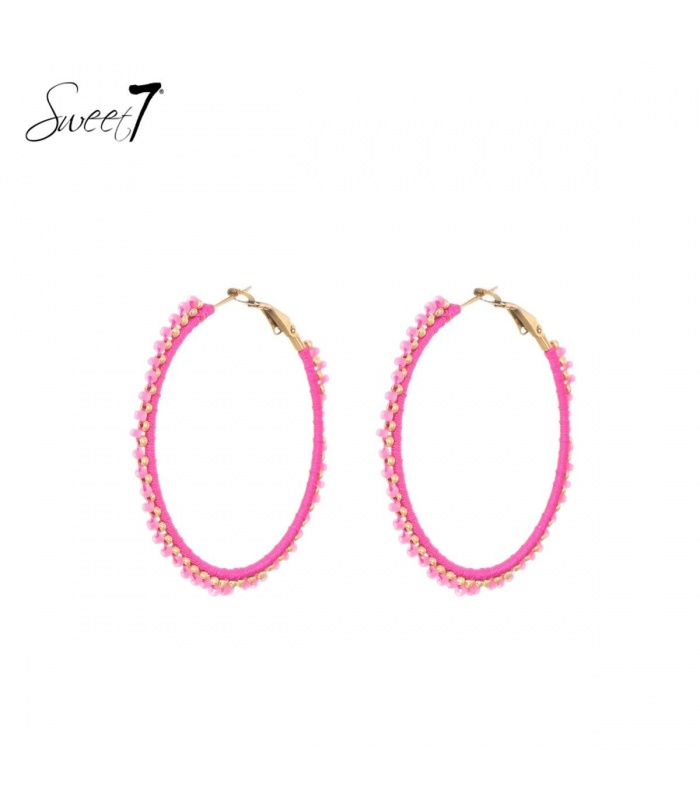 Op zoek naar opvallende oorringen die je outfit een trendy en speelse uitstraling geven? Ontdek deze prachtige roze oorringen met koord en glas kralen van het merk Sweet7. Deze oorringen zijn ontworpen om te pronken en je een unieke en modieuze look te geven.