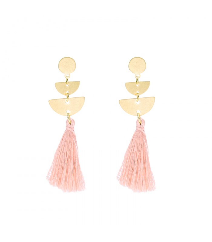 Goudkleurige oorhangers met verschillende elementen en een roze kwast.