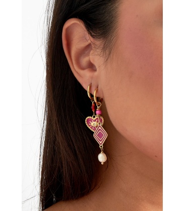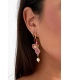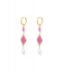 Goudkleurige oorringen met roze bedel, kralen en parel.