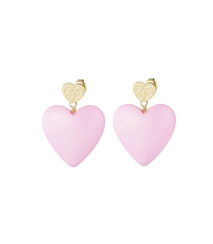 Nieuwe collectie met deze unieke roze harten oorhangers. Het ontwerp combineert moeiteloos romantiek met een vleugje luxe, dankzij het verfijnde goudkleurige hartje dat dient als het oor stuk. Ideaal voor elke fashionista die haar outfit een liefdevolle touch wil geven.