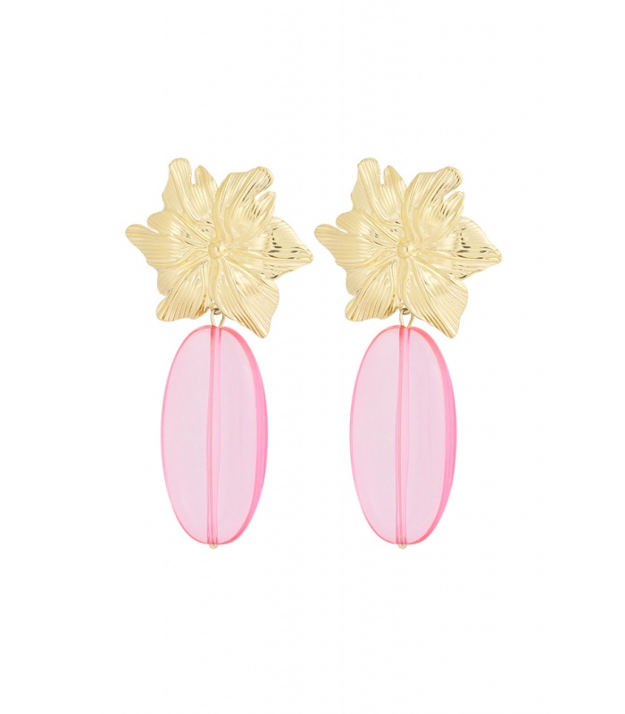 Roze oorhangers met een goudkleurige bloem