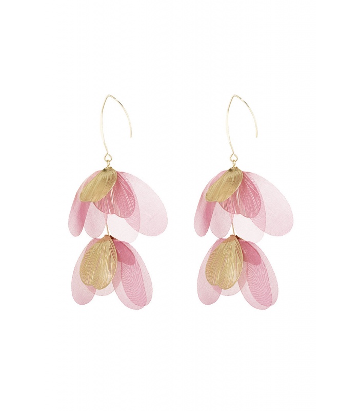 Deze oorbellen combineren zachte roze stof met stijlvolle goudkleurige details, wat zorgt voor een elegante en modieuze uitstraling. De combinatie van textiel en metaal geeft een unieke touch aan je look.