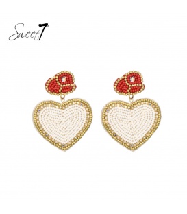 Witte kralen oorhangers in de vorm van een hart en een rood oor stukje.