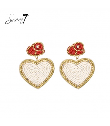 Witte kralen oorhangers in de vorm van een hart en een rood oor stukje