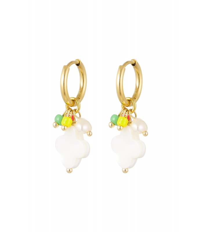 Goudkleurige oorringen met een witte klaver en gekleurde kraaltjes.