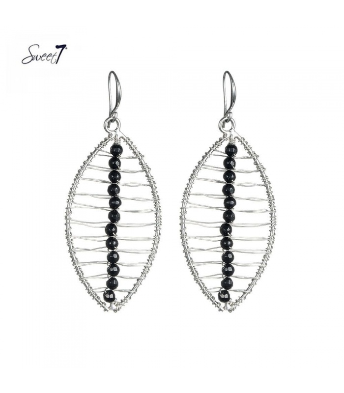 Zilverkleurige blad oorhangers met een zwarte kralen nerf.