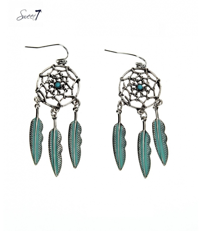 Zilverkleurige dromenvanger oorhangers met 3 turquoise veertjes.