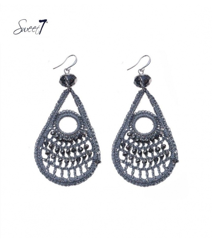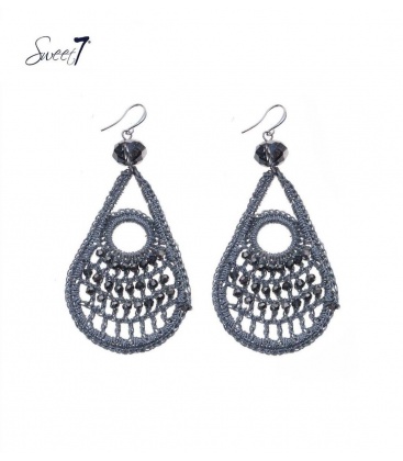 Zilverkleurige gehaakte oorbellen met in de hanger kleine grijze strass steentjes