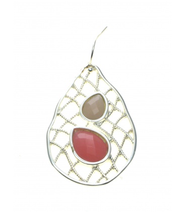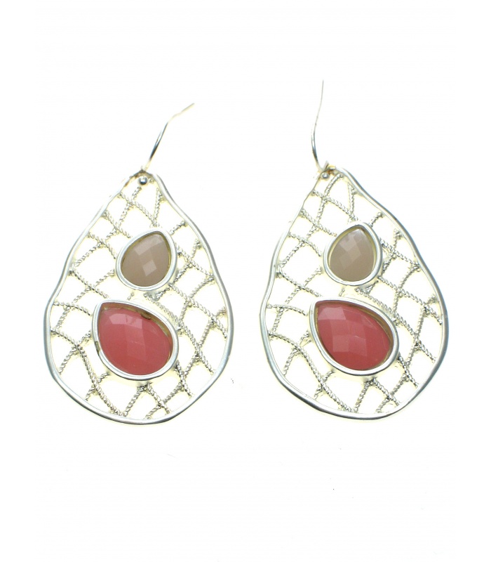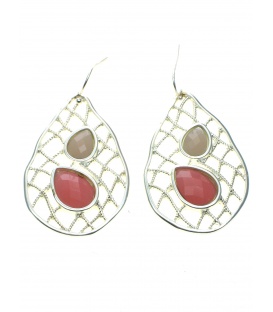 Zilverkleurige oorbellen met een mooi motief in de hanger en roze steentjes