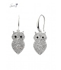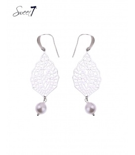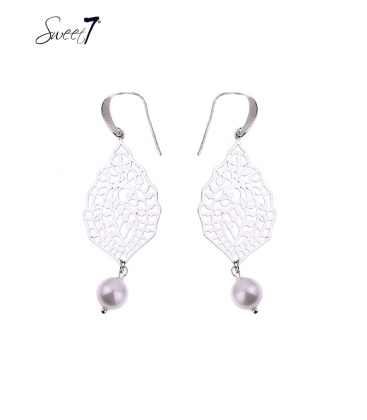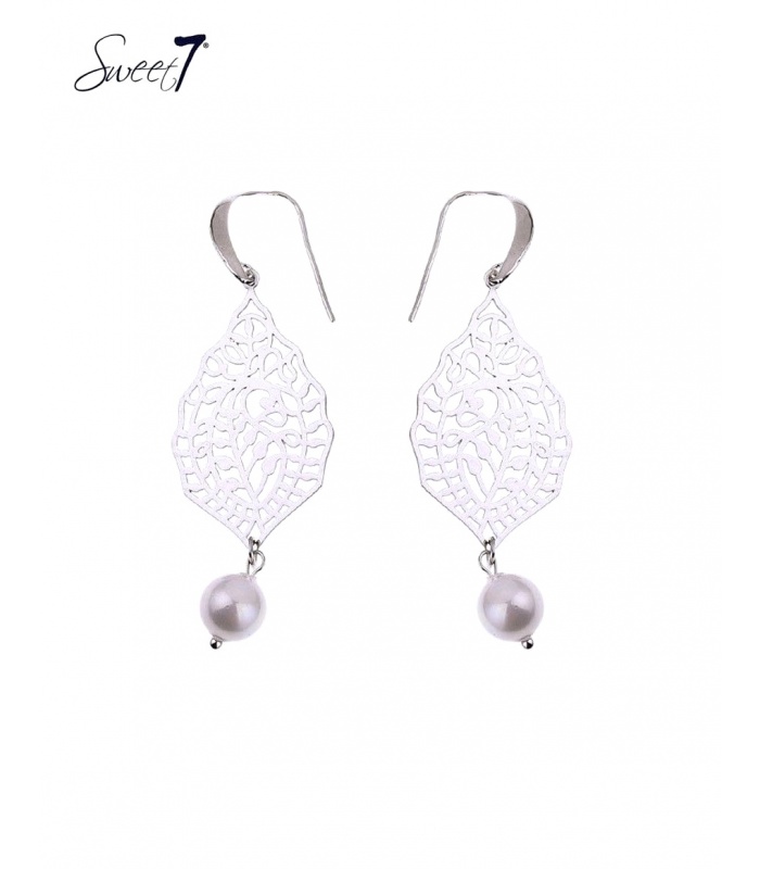 Zilverkleurige oorbellen met motief in de hanger en een schelpen parel.