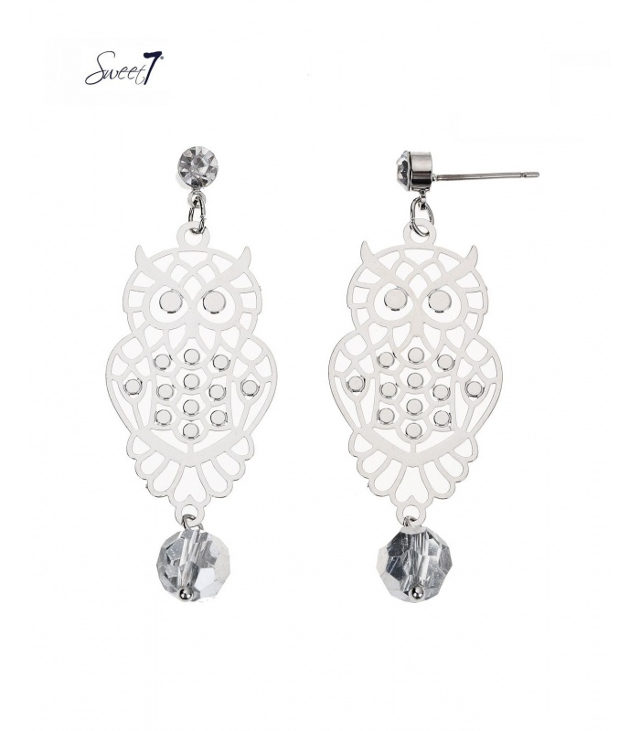 Zilverkleurige oorhangers in de vorm van een uiltje en kraal