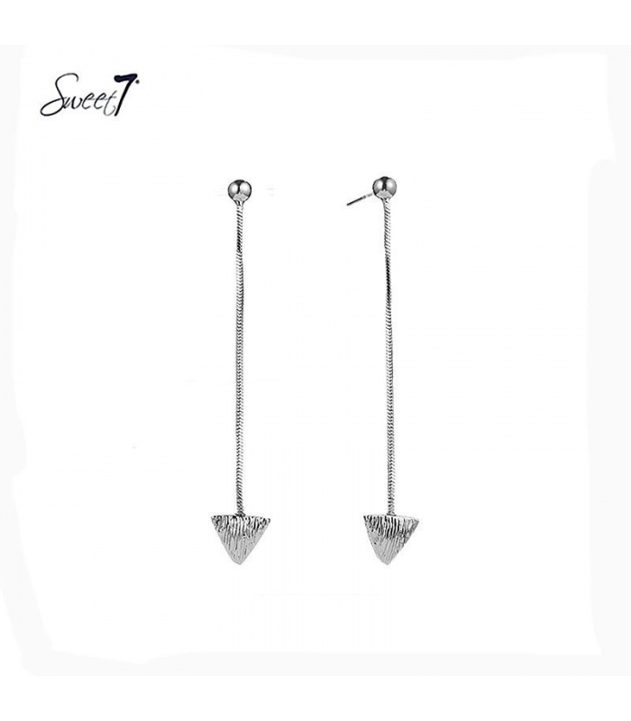 Zilverkleurige oorhangers met een bewerkt driehoekje .
