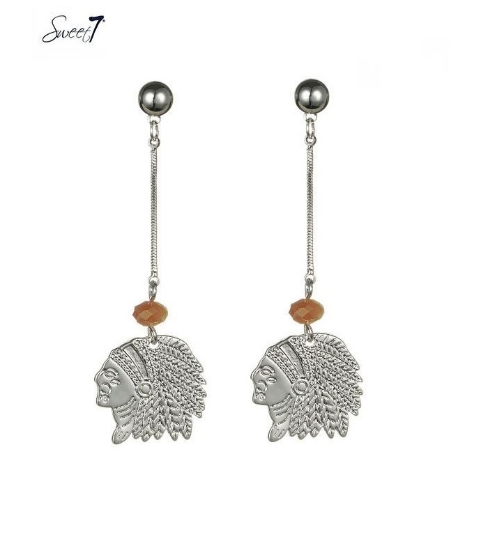 Zilverkleurige oorhangers met een indianen hoofd en bruin kraaltje.