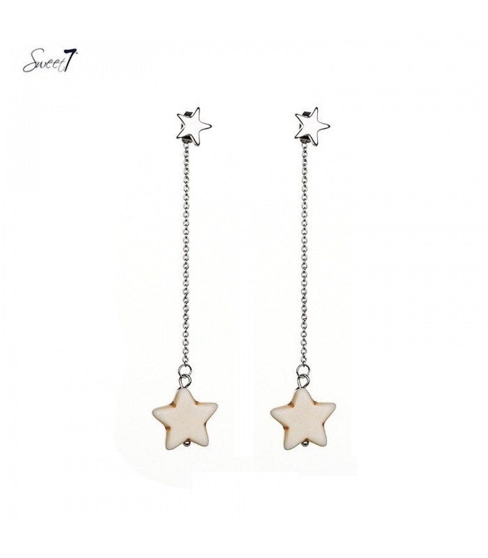 Zilverkleurige oorhangers met een witte ster aan een kettingkje.