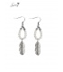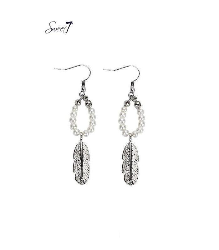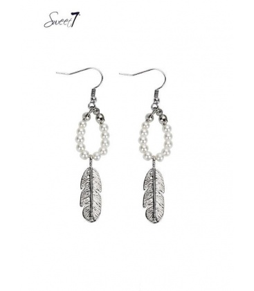 Zilverkleurige oorhangers met veer en kleine witte pareltjes.