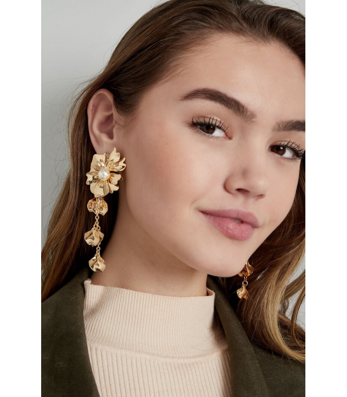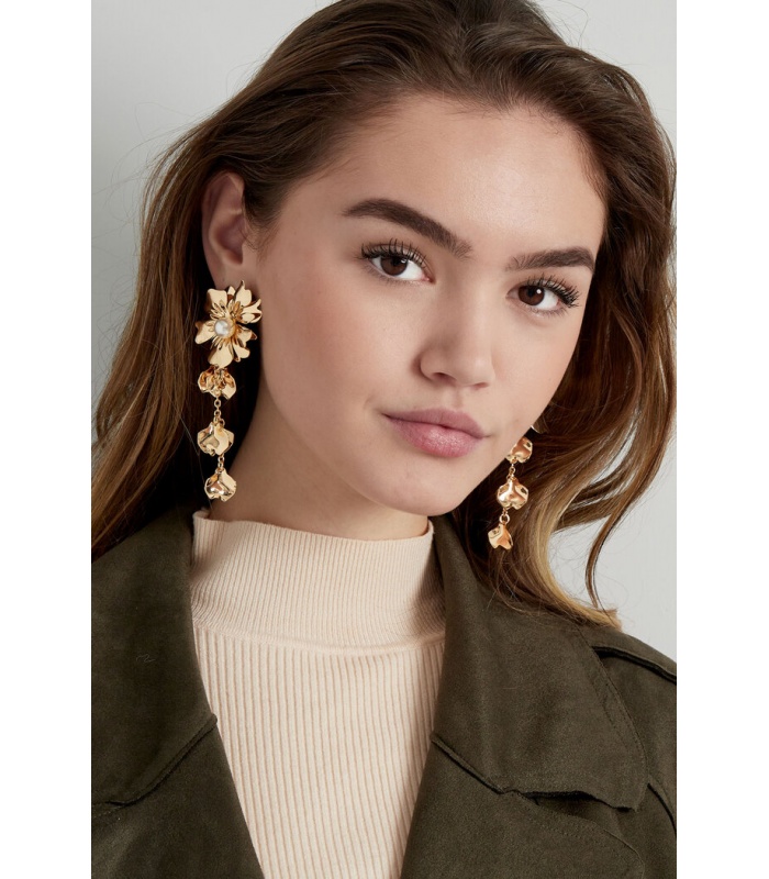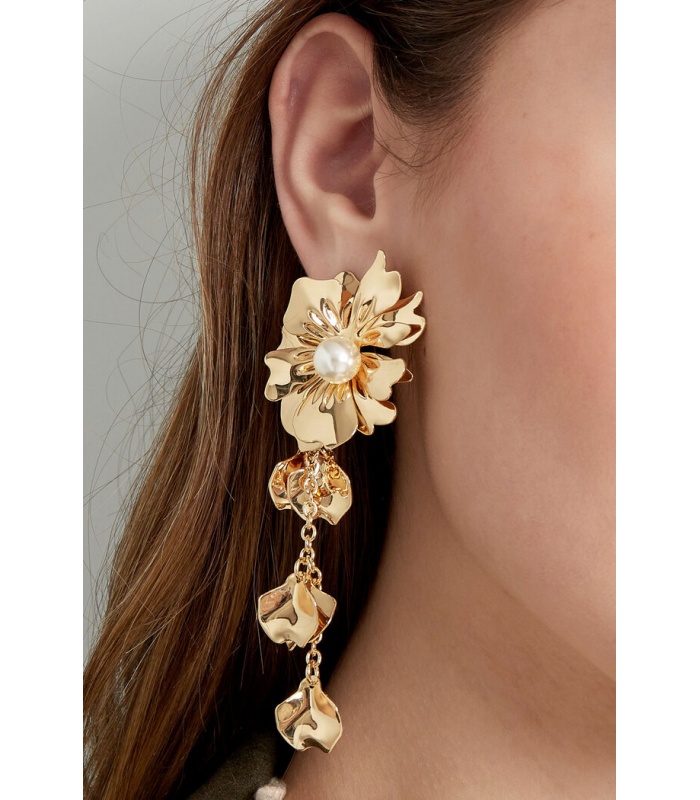 Zilverkleurige bloemen oorhangers met een acryl pareltje
