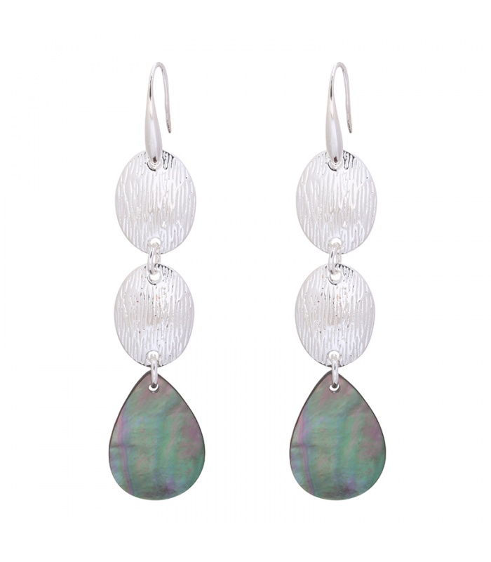 Zilverkleurige lange oorbellen met 3 hangers, 1 daarvan is een schelpen hanger.