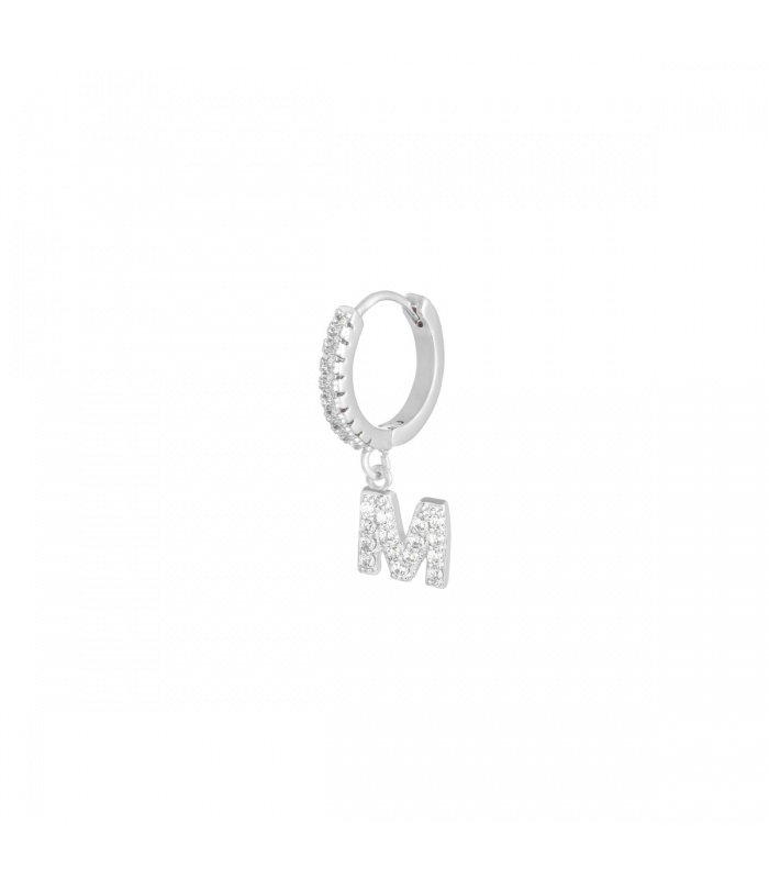 Zilverkleurige oorbel met steentjes en hanger met de letter M.