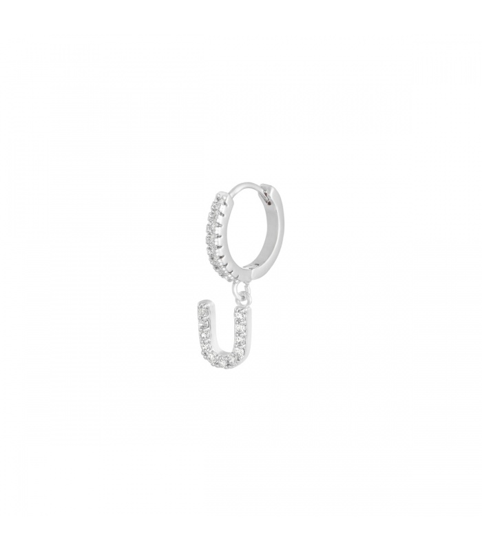 Zilverkleurige oorbel met steentjes en hanger met de letter U.