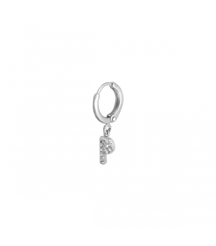Zilverkleurige oorbel met zirkonia steentjes en initiaal P