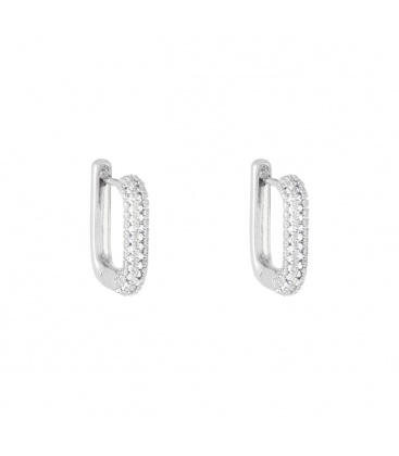 Zilverkleurige oorbellen in rechthoekige vorm met sierstenen aan de voorkant.