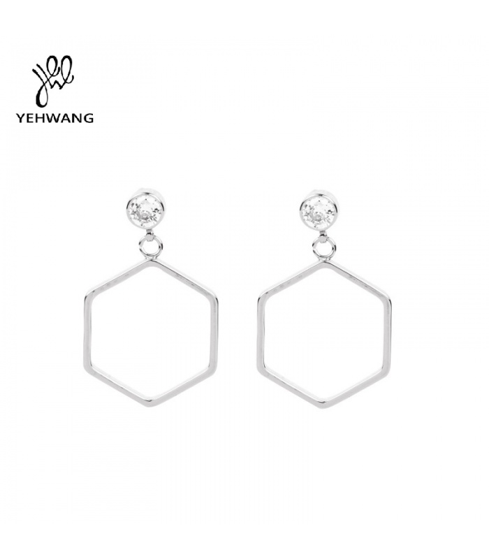 Zilverkleurige oorbellen met een 6 hoekige hanger en helder strass steentje op de steker.