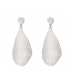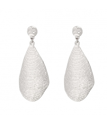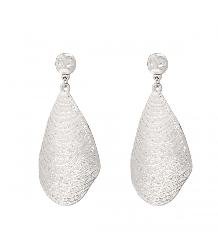 Zilverkleurige oorbellen met een bewerkte metalen hanger.