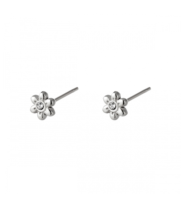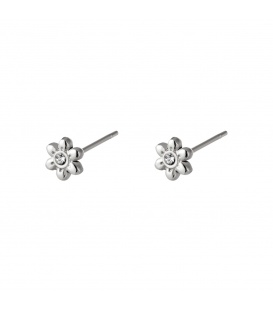 Zilverkleurige oorbellen met een klein bloemetje en zirkoonsteentje.