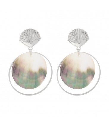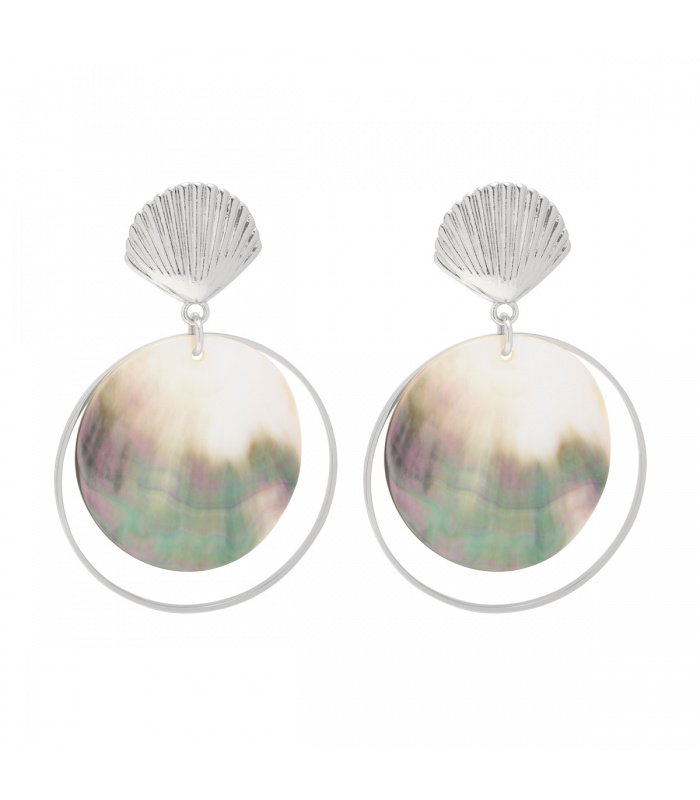Zilverkleurige oorbellen met schelp en grote ronde hanger van parelmoer.