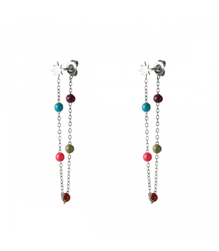 Zilverkleurige oorhangers met gekleurde bolletjes.