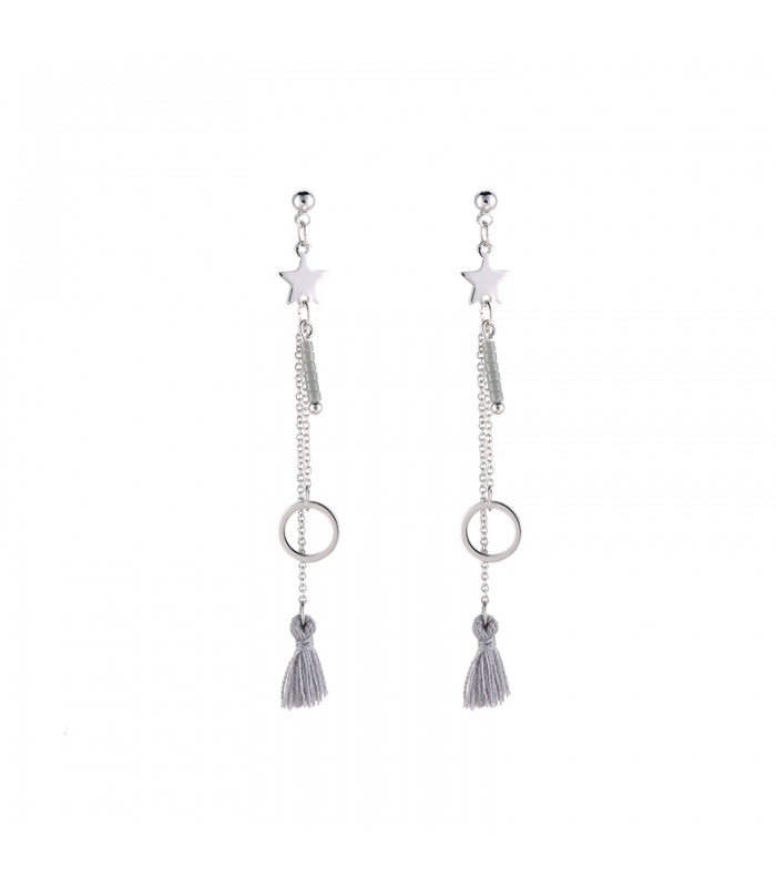 Zilverkleurige oorhangers met ster en grijze kwast aan aan een dun kettinkje.