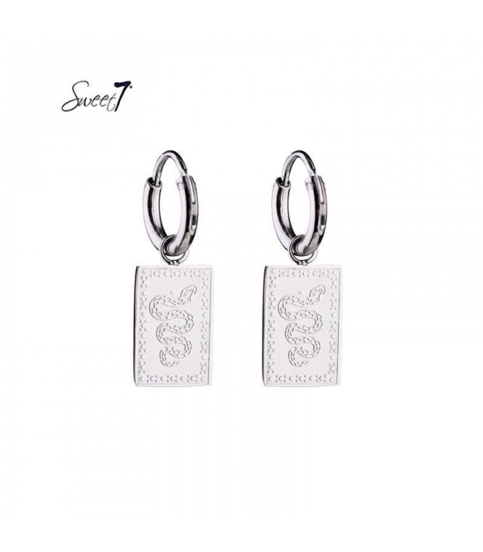 Zilverkleurige oorringen met een vierkante hanger en slangen print.