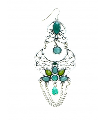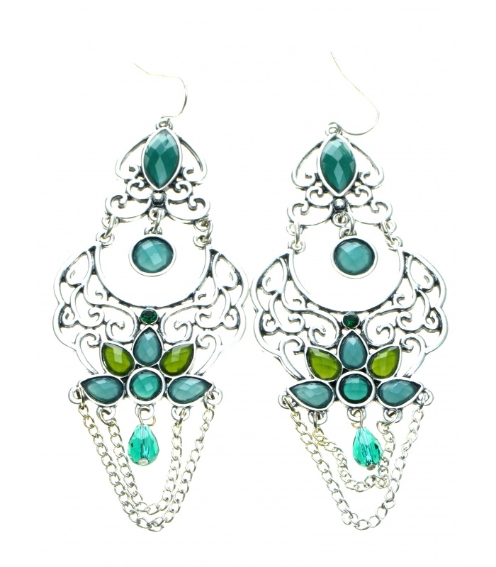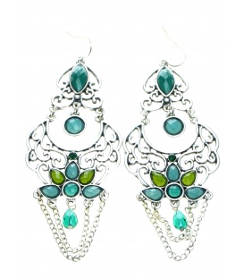 Zilverkleurige oorhangers met mooie blauwe, groene steentjes en kettinkjes
