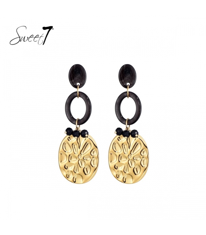Wil je iets dragen dat zowel krachtig als verfijnd oogt? Deze oorbellen van Sweet7 combineren een diepe zwarte marmerlook met een glanzende, goudkleurige hanger. De subtiele zwarte kraaltjes boven de ovale plaat zorgen voor een speelse touch met een luxe uitstraling.