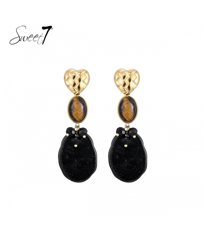 Zoek je oorbellen die opvallen en toch verfijnd blijven? Deze Sweet7 oorbellen combineren een gevlochten hartvorm met een cat eye steen en een diepzwarte hanger met subtiele glitters. De combinatie voelt luxe aan en straalt zelfvertrouwen uit.