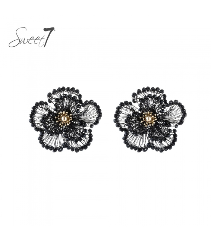 Oorbellen zwart met draadstructuur met bloemdesign en goudkleurige kern