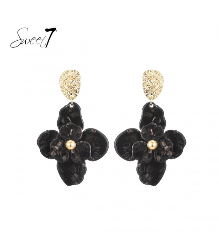 Deze elegante Sweet7 oorbellen hebben een stijlvolle en moderne uitstraling. Ze bestaan uit een opvallend bloemontwerp in glanzend zwart, waarbij de bloemblaadjes een subtiele structuur hebben voor extra diepte en karakter. In het midden van de bloem zit een goudkleurig bolletje, wat zorgt voor een chique accent. De oorbellen hangen aan een goudkleurige, organisch gevormde steker met een fijn reliëfpatroon, wat ze een luxueuze uitstraling geeft