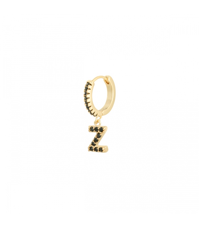 Goudkleurige oorbel met zwarte steentjes en hanger met de letter Z.