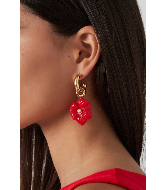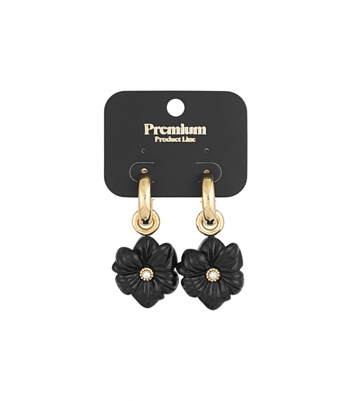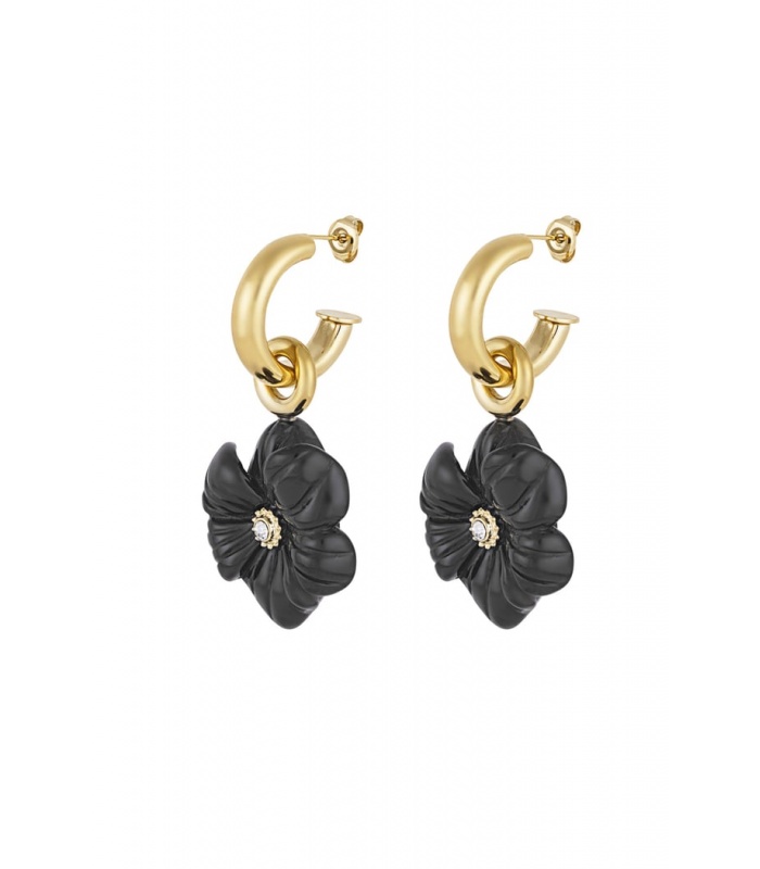 Deze goudkleurige oorbellen zijn voorzien van een elegante zwarte bloemenhanger, wat zorgt voor een stijlvolle en tijdloze uitstraling. Het contrast tussen het glanzende goud en de diepe zwarte bloem maakt deze oorbellen een opvallende toevoeging aan elke outfit.