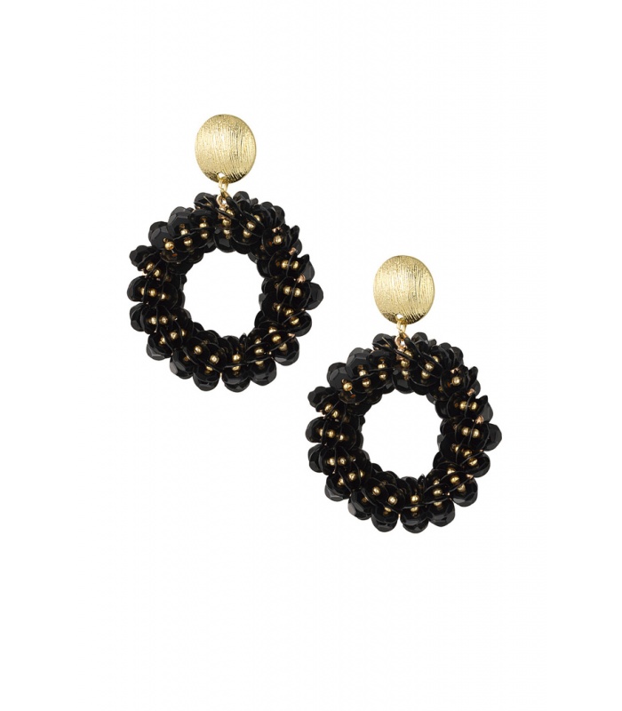 Deze stijlvolle zwarte oorbellen combineren de elegantie van diepzwarte kralen met subtiele goudkleurige accenten. Het goudkleurige oor stukje voegt een luxe touch toe, wat zorgt voor een chique en verfijnde uitstraling. Perfect om zowel je dagelijkse outfit als je avondlook een vleugje glamour te geven.