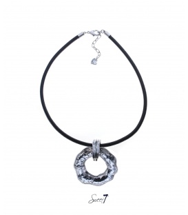 Zwarte koord halsketting met een zilverkleurige hanger.