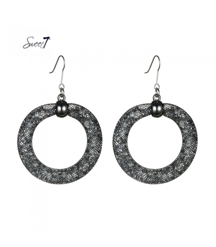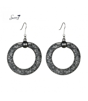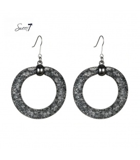 Oorbellen gemaakt van een nylon mesh gevuld met kleine grijze kunststof glitter steentjes.
