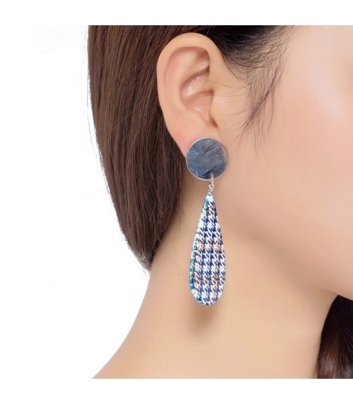 Blauwe langwerpige oorclips met zilverkleurige klem.