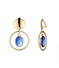 Goudkleurige oorclips met blauwe bolvormige hanger bezet met strass steentjes.