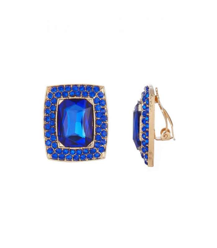 Opvallende grote blauwe oorclips met dubbele rij strassteentjes.
